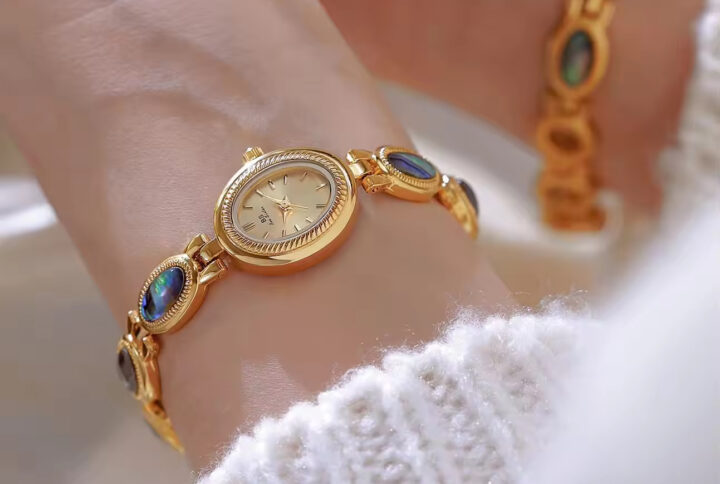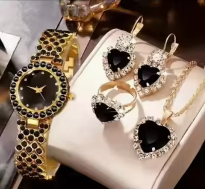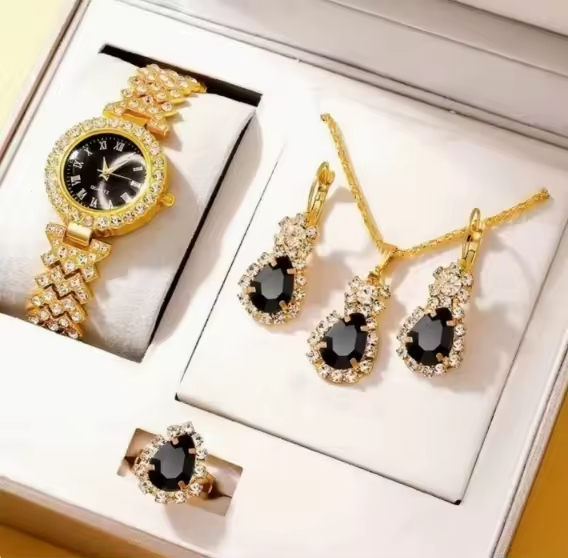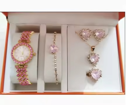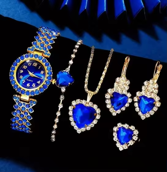 Elegant Women’s Blue Rhinestone Jewelry Set Heart Necklace Jewelry Rhinestone Blue Stone Gold Accents Quartz Watch