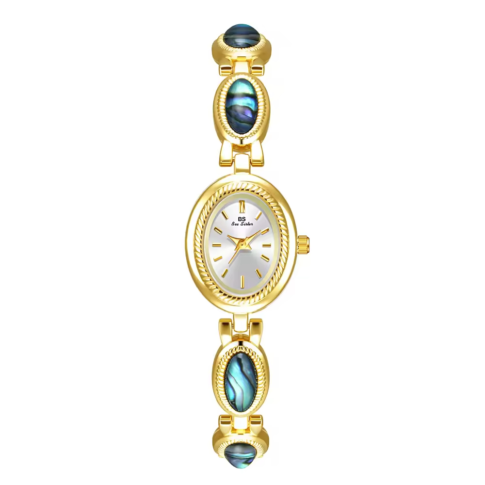 Bee Sister High-End Vintage Quartz Watch for Women Waterproof Alloy Bracelet Black Gold Abalone Shell Ronda Movement Glass Dial